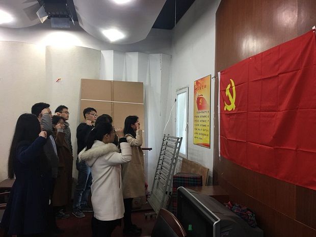 首先,在孔银银老师的带领下,全体党员面向党旗,庄严宣誓。魏山老师带领大家集体诵读党章第二章《党的组织制度》。