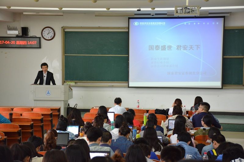 (足球现场比分 团委记者:周会璇)2017年4月20日,旨在传播证券知识、提升就业技巧的“国泰君安证券知识”讲座在文波楼401教室举行。我校知名校友、国泰君安证券武汉洞庭街营业部总经理熊东平为此次讲座主讲人,足球现场比分 党总支书记丁奕、团总支书记余利以及足球现场比分 、统数学院等学院学生参加了此次讲座。