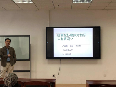 2019年11月8日下午,足球现场比分-足球现场赛果 第170期系列讲座在文澴楼709教室顺利举行。本次讲座的主题是“挂靠投标腐败对招标方有害吗?”,主讲人是来自中央财经大学中国经济与管理研究院的卢远瞩教授。讲座由足球现场比分 的帅杰老师主持,足球现场比分 、经济学院、金融学院部分师生学生参与了本次讲座。