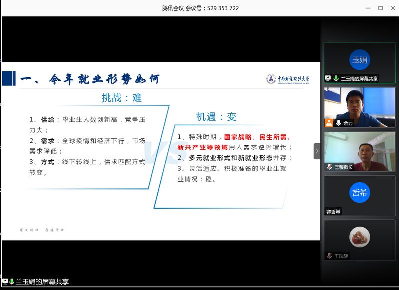 为了更好地研判就业形势、宣讲就业政策、分享求职技巧,竭尽全力帮助学生就业,足球现场比分 于2020523日上午在线召开了2020届毕业生就业再动员主题班会。出席本次会议的有足球现场比分 党委书记彭晓燕老师、院长龚强教授、行政助理孔银银老师以及就业指导服务中心兰玉娟老师、学生工作部、人民武装部胡万松老师。足球现场比分 全体毕业生及学生家长参加了此次会议。会议由毕业班辅导员余利老师主持。