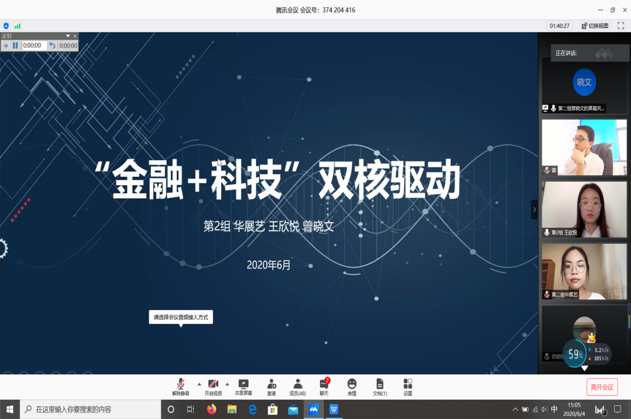 经过初赛答题后,共有24名选手脱颖而出进入复赛。于64日举行的复赛中,24名选手组成8个小组,依次就所给的4个案例进行了小组分析的两两对决。各组选手灵活地运用自己所学的专业知识和各类数据的统计分析,分别对“针对5G时代下围绕‘网络直播’展开的商业模式做出预测”、“为我国从事网络安全业务的企业制定未来的发展战略”、“结合本次疫情的实际情况分析互联网金融是否能有效保证我国经济的复苏”和“结合我国金融科技产业发展现状,为‘如何有效利用金融来驱动科技发展,使科技能更好地服务于金融’提出建议”等案例进行了深刻剖析。
