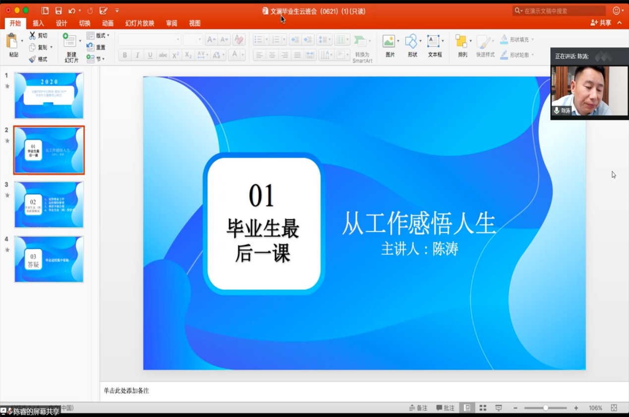 班会第一项,由陈涛先生进行以《在工作中感悟人生》为题的毕业“最后一课”。首先,他结合自己的工作生涯总结出了人生的感悟:做事认真,做人老实。他建议大学生要走出国门,去开拓自己的眼界,不断增强自己的综合能力。但他强调学生在国外进行深造之后,最重要的是要回报祖国,这是青年学生爱国精神的具体实践。