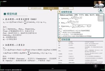 中文组的傅施越同学使用公式阐述了对国家创新型城市的政策效应的研究;龚教伟同学以沪港通为例,分析了资本市场开放能提高分析师盈余预测精准度;黄祺林同学则分析了银行竞争如何提高了宏观经济效率。英文组的郑抒扬同学从委托代理问题入手,分析了具有网络外部性的纵向关联市场中的合作与非合作管理委派;古剑秋同学分析了企业社会责任与股价暴跌风险管理能力的作用;最后陆阳同学以流利的英语分析了企业特征与环境污染的问题。