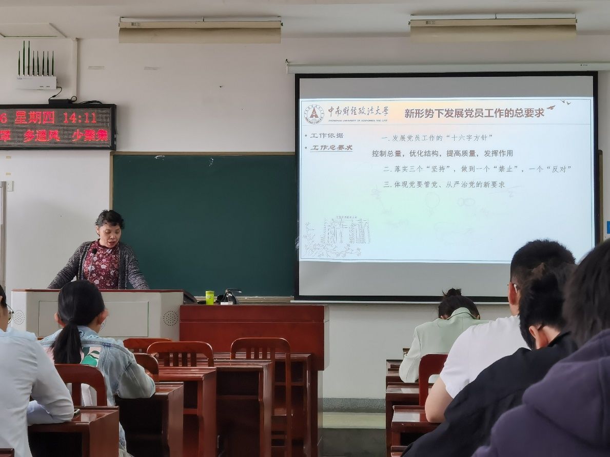 最后,李明老师强调了严格按照党章和《细则》的规定严格履行入党手续的重要性。她提出,履行入党手续和程序是一项严肃的政治性工作,是对申请人的一次严肃教育和审查。之后,李老师介绍了中南财经政法大学发展党员工作流程图,详细介绍了申请入党人至最终发展为正式党员所需的五个流程,并结合实际情况向同学们传授了许多经验。