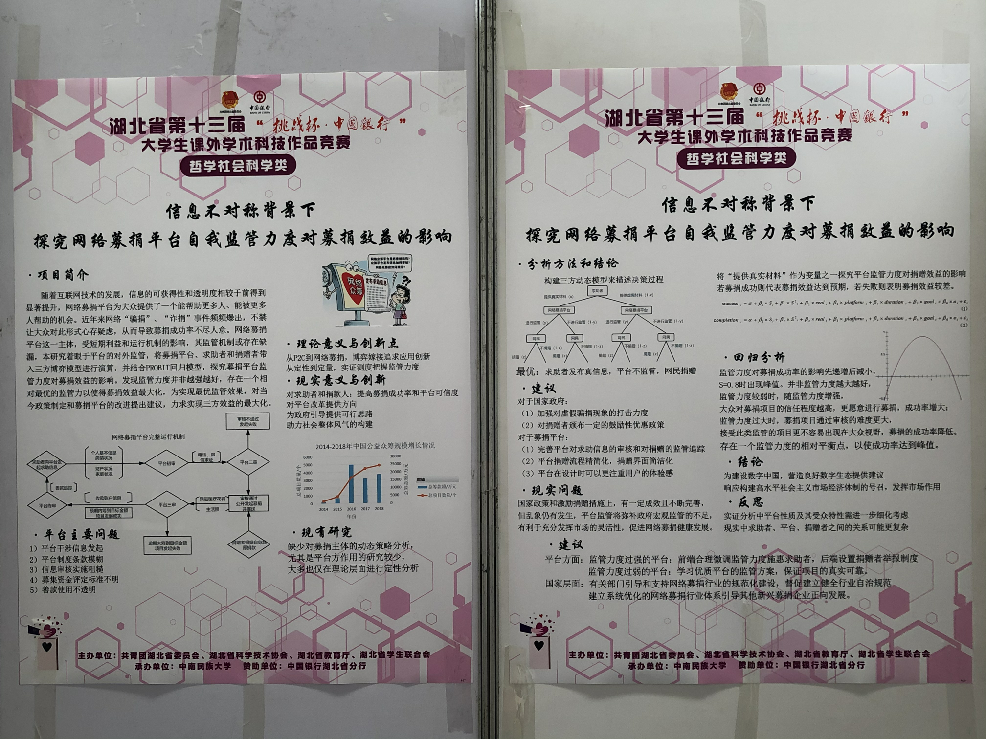 (通讯员/吴雨 刘千惠)2021年5月9日上午8时,由团省委、省科协、省教育厅、省学联共同主办的湖北省第十三届“挑战杯·中国银行”大学生课外学术科技作品竞赛终审决赛暨闭幕式在中南民族大学举行。我校斩获一等奖2项,二等奖4项,三等奖6项,并获得“优胜杯”荣誉称号,获奖作品数量创历史新高。其中,足球现场比分 队伍参赛作品《信息不对称背景下,探究网络募捐平台自我监管力度对募捐效益的影响》荣获二等奖;同时,本项目也在校内第七届“明理杯”大学生创新创业竞赛创新类中荣获二等奖。