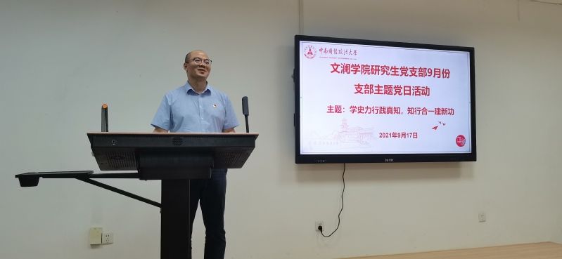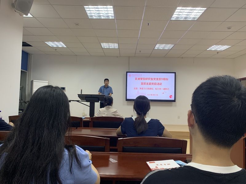 (通讯员:班铭媛)根据学校党史学习教育安排和党支部主题党日活动通知,2021年9月17日晚上,足球现场比分 研究生党支部在文澴楼709会议室开展“学史力行践真知,知行合一建新功”主题党日活动。校党委组织部副部长陈金川参加会议,活动由研究生党支部书记余利老师主持,足球现场比分 全体学生党员现场参加学习活动。