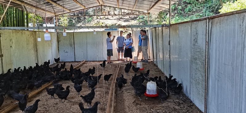 25日上午,调研小组前往普洱镇沿江村调研乌骨鸡产业发展状况。在行驶近一个半小时的车程后,调研小组踏过乡间土路,通过亲身感受乡村产业发展的种种局限,来到乌骨鸡养殖场。乌骨鸡养殖场采用棚养与散养相结合的方式,最大程度保留乌骨鸡的鲜美口味。但限于交通限制,到养殖场只有泥土路可以通行,导致运输成本增加,在一定程度上限制了产业发展。调研小组与镇政府成员及养殖场负责人就乌骨鸡产业发展进行了深入的沟通交流,进一步对产业发展提出建议。