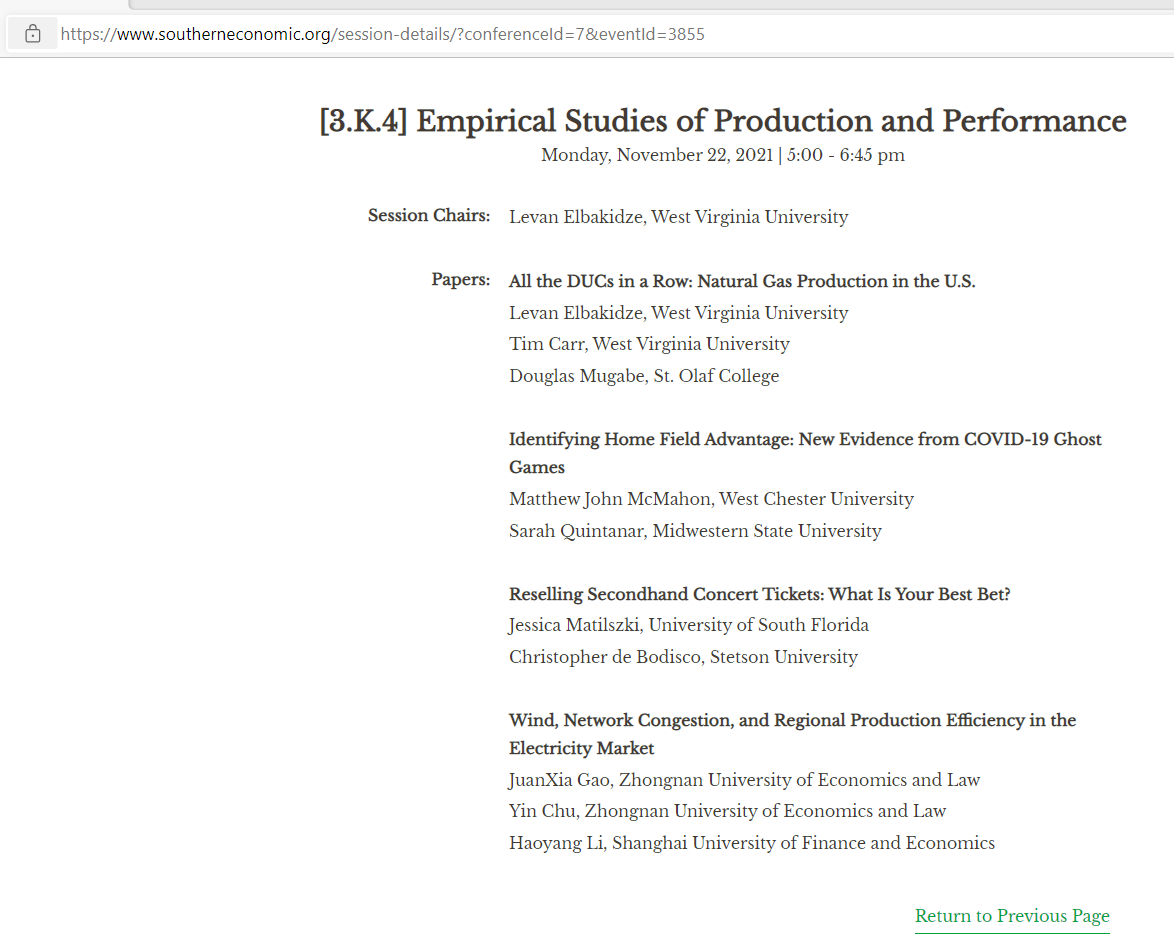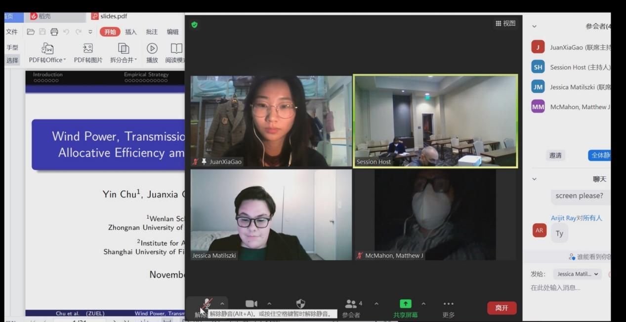 高涓夏同学本次参与的分会场主题为“Empirical Studies of Production and Performance”中,报告的文章题目为“Wind, Network Congestion and Regional Production Efficiency in the Electricity Market”(文章指导老师与合作者:足球现场比分 褚印副教授)。本篇研究关注风能发电比重上升对电网输电堵塞的影响,并发现其显著降低了区域市场内传统化石燃料发电机组的调度和生产效率。整个展示内容包括20分钟的论文报告与5分钟左右的参会者提问、讨论环节,高涓夏同学通过与会获得了良好的建议和修改意见。本会场其他参与者分别来自西弗吉尼亚大学(West Virginia University),宾州西彻斯特大学(West Chester University)以及南佛罗里达大学(University of South Florida)。他们各自分享了题为“All the DUCs in a Row: Natural Gas Production in the U.S.”、“Identifying Home Field Advantage: New Evidence from COVID-19 Ghost Games”、“Reselling Secondhand Concert Tickets: What Is Your Best Bet?”的学术论文。