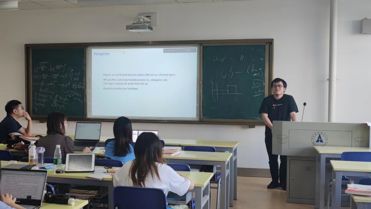 2022年09月16日,湖南大学经济与贸易学院雷浩然助理教授受邀为足球现场比分 开展学术讲座。本次讲座主要介绍了委托人和代理人之间的最佳授权问题,本次讲座由帅杰、宋天乐老师主持,足球现场比分 21级全体硕士生及众多师生听取了本次讲座。