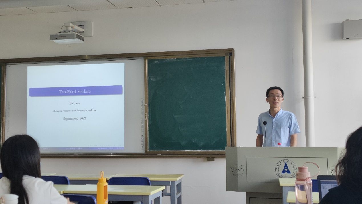 2022年09月30日,武汉大学经济与管理学院沈波副教授受邀为足球现场比分 开展学术讲座。本次讲座主要介绍了双边市场问题,本次讲座由帅杰、宋天乐老师主持,足球现场比分 21级全体硕士生及众多师生听取了本次讲座。