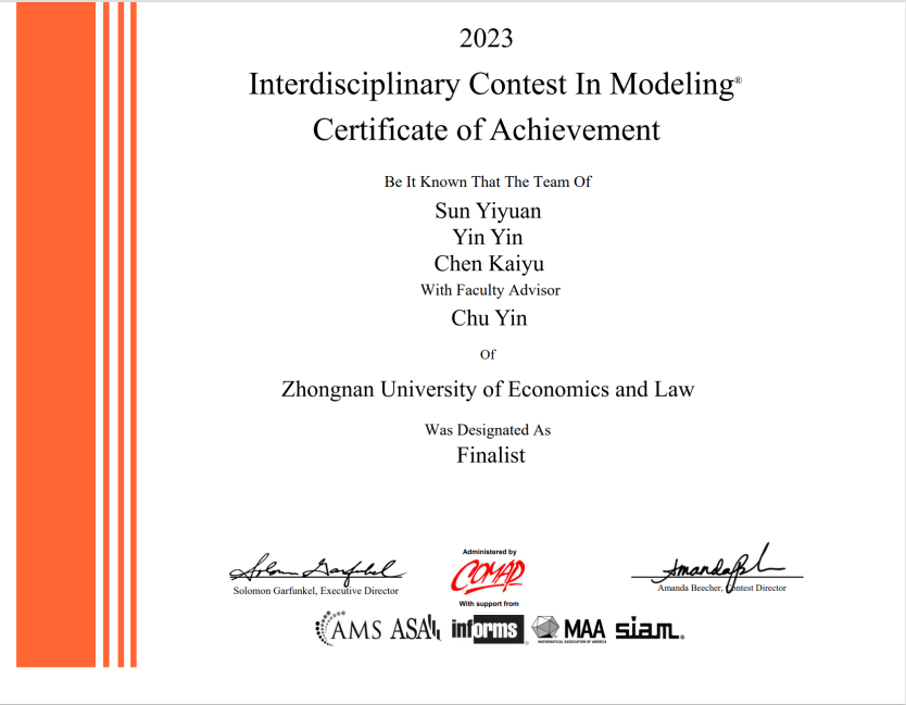 获奖等级:一等奖(Meritorious Winner) 指导老师:黄伟哥 学生:王梓为,蔡一丹,朱芷萱