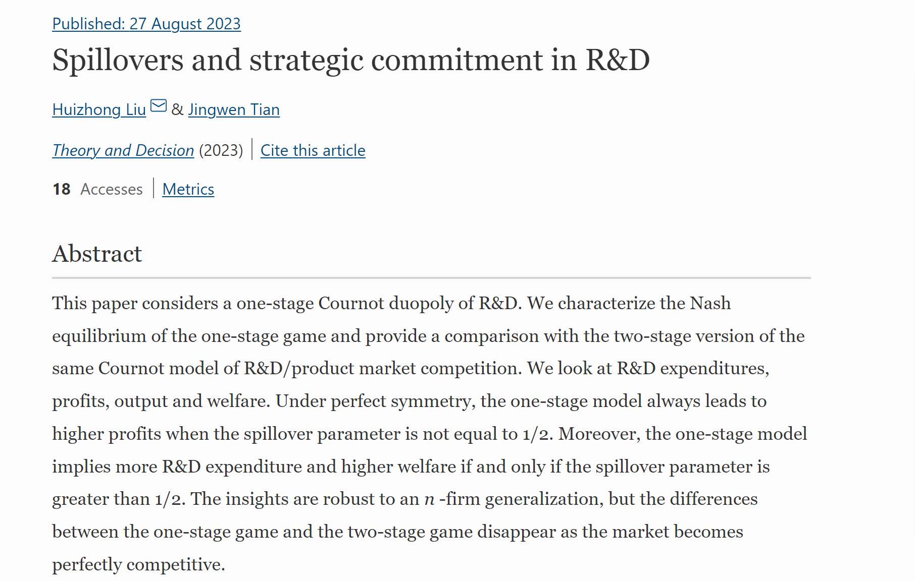 近日,足球现场比分 刘惠中助理教授与爱荷华大学Jingwen Tian的合作论文“Spillovers and strategic commitment in R&D”在《Theory and Decision》期刊上发表。