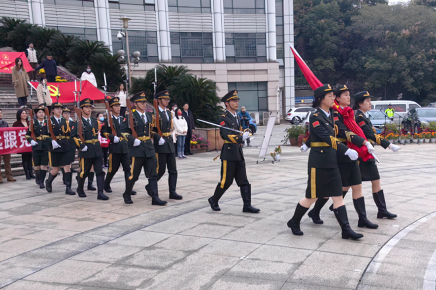 升旗仪式开始,英姿挺拔的国旗护卫队护卫着鲜艳的五星红旗,迈着庄严整齐的步伐入场。全体师生齐唱国歌,国旗在庄严的国歌声和全体师生的注目礼中冉冉升起。