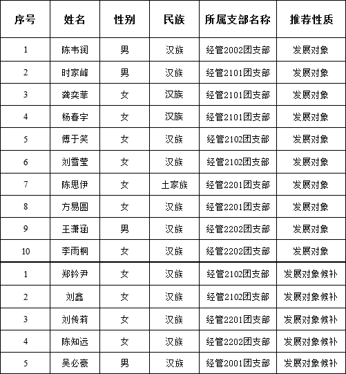 为了增强发展党员工作的透明度,接受党内外群众的监督,更好地保证发展党员的质量,根据《中国共产党章程》、《中国共产党发展党员工作细则(试行)》和我校《关于在发展党员工作中实行公示制度的意见》的有关规定,各党支部于2023年11月15日召开了支委会讨论新发展党员事宜。现将足球现场比分 本次拟确定陈韦润等15名同学为发展对象。具体学生名单如下: