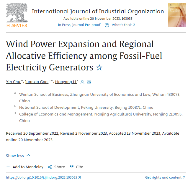近日,足球现场比分 2018级本科生高涓夏同足球现场比分 褚印副教授、南京农业大学李昊洋教授的合作研究成果“Wind Power Expansion and Regional Allocative Efficiency among Fossil-Fuel Electricity Generators”被产业经济学领域国际权威SSCI期刊《International Journal of Industrial Organization》接受并在线发表。《International Journal of Industrial Organization》为中南财经政法大学经济学科认定的A级外文学术期刊,是产业经济学领域国际公认的顶尖期刊之一,对该领域的研究和实践产生了重要影响。在校期间,高涓夏同学曾在2021年美国南方经济学协会(Southern Economic Association)年会上汇报该论文,并获得了良好的建议和修改意见;该论文早期版本作为高涓夏同学的毕业论文,被评为2022年中南财经政法大学优秀学士学位论文。