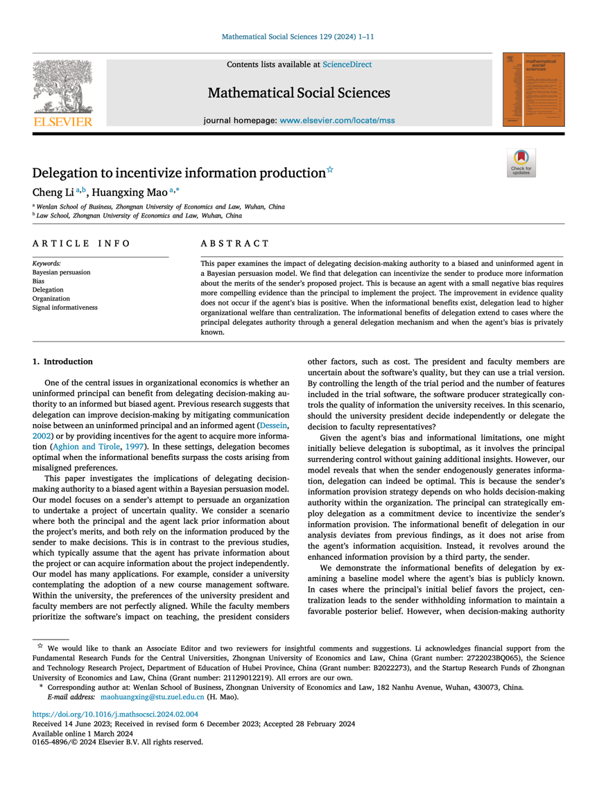 近日,足球现场比分 2021级本科生毛黄兴与其导师李程教授共同完成的研究论文《Delegation to Incentivize Information Production》在国际知名经济学期刊《Mathematical Social Sciences》上发表。这是足球现场比分 本科生再一次在国际SSCI期刊上发表其研究成果。