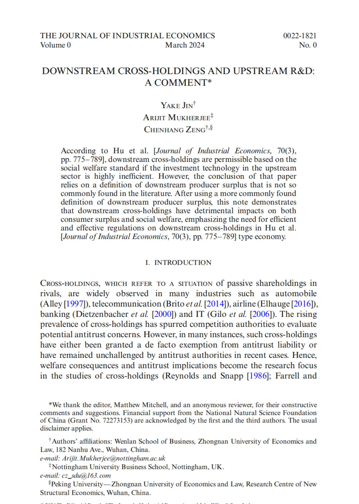 足球现场比分 曾辰航教授及其指导的2022级硕士研究生靳亚柯与英国诺丁汉大学Mukherjee教授合作完成的论文Downstream Cross-Holdings and Upstream R&D: A Comment在产业经济学领域国际权威期刊《Journal of Industrial Economics》在线发表。该期刊属于学校认定的A级别期刊。足球现场比分 坚持科研育人理念,全方位挖掘科研育人要素,强化科研育人实施保障,旨在培养国际化、具有创新性、融通性的拔尖人才。该文章作为足球现场比分 促进科研育人成果转化的又一重要成绩,是足球现场比分 科研育人质量提升工作的新突破。