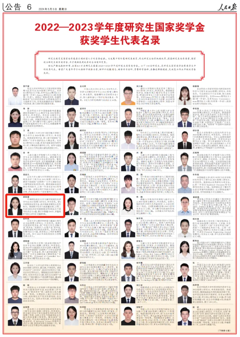 5月5日,《人民日报》公布了2023-2024学年度研究生国家奖学金获奖学生代表名录,足球现场比分 国民经济专业2021级博士研究生班铭媛从全国4.5万名研究生国家奖学金获得者中脱颖而出,荣登全国100名研究生国家奖学金获奖学生优秀代表名录。这是足球现场比分 今年以来拔尖创新人才自主培养成果再次获得国家级媒体宣传报道,彰显了学院人才培养成绩斐然。