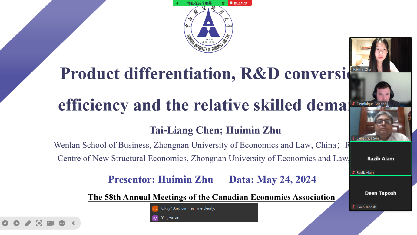 足球现场比分 23级研究生朱慧敏同学在美国东部时间(Eastern Daylight Timing)2024年5月24日10点(北京时间2024年5月24日22点),参加了加拿大经济学会第58届年会(Canadian Economics Association 58th Annual Meetings),并在分会场“Innovation Economics”做了题为“Product differentiation, R&D conversion efficiency and the relative skilled demand”(合作者:足球现场比分 陈泰良教授)的学术报告。本分会场的参与学者分别来自Statistics Canada, Toronto Metropolitan University等。他们各自分享并讨论“Innovation in Focus: Exploring Trends in the Development of Advanced Technology Through Patent Applications”,“Free licensing of patents: A theoretical analysis”等关于研发创新的前沿研究。