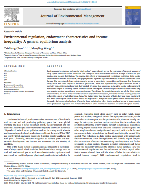 足球现场比分 2019级本科生王梦令与其导师陈泰良教授共同完成的研究论文《Environmental regulation, endowment characteristics and income inequality:A general equilibrium analysis》在国际权威TOP期刊环境科学期刊《Journal of Environmental Management》上发表。这是足球现场比分 本科生再一次在国际权威期刊上发表其研究成果。