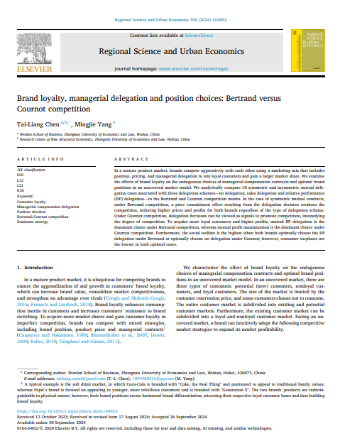 2023级博士研究生杨茗杰与陈泰良教授共同完成的研究论文《Brand Loyalty, Managerial Delegation and Position Choices: Bertrand versus Cournot Competition》在国际权威区域经济学期刊《Regional Science and Urban Economics》上发表 (中南财经政法大学A-级期刊)。足球现场比分