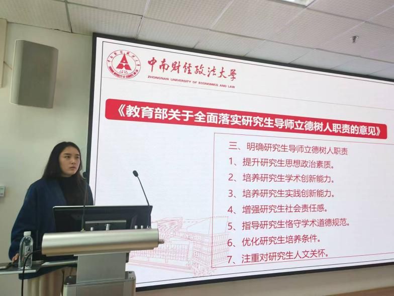 研究生工作办公室主任刘千惠为参会教师系统讲解了研究生导师应当如何落实职责,培养全面发展的新时代研究生。一是要提升学生思想素质,为党育人、为国育才;二是要认真学习导师作为研究生培养第一责任人的工作职责和相关要求,深入学习贯彻落实学校、学院的有关文件精神,在思想品德、专业素养、生活状况、身心健康、就业创业等方面注重全面培养;三是要严格落实过程化管理,包括学术管理和日常管理,形成良好的学习风貌。