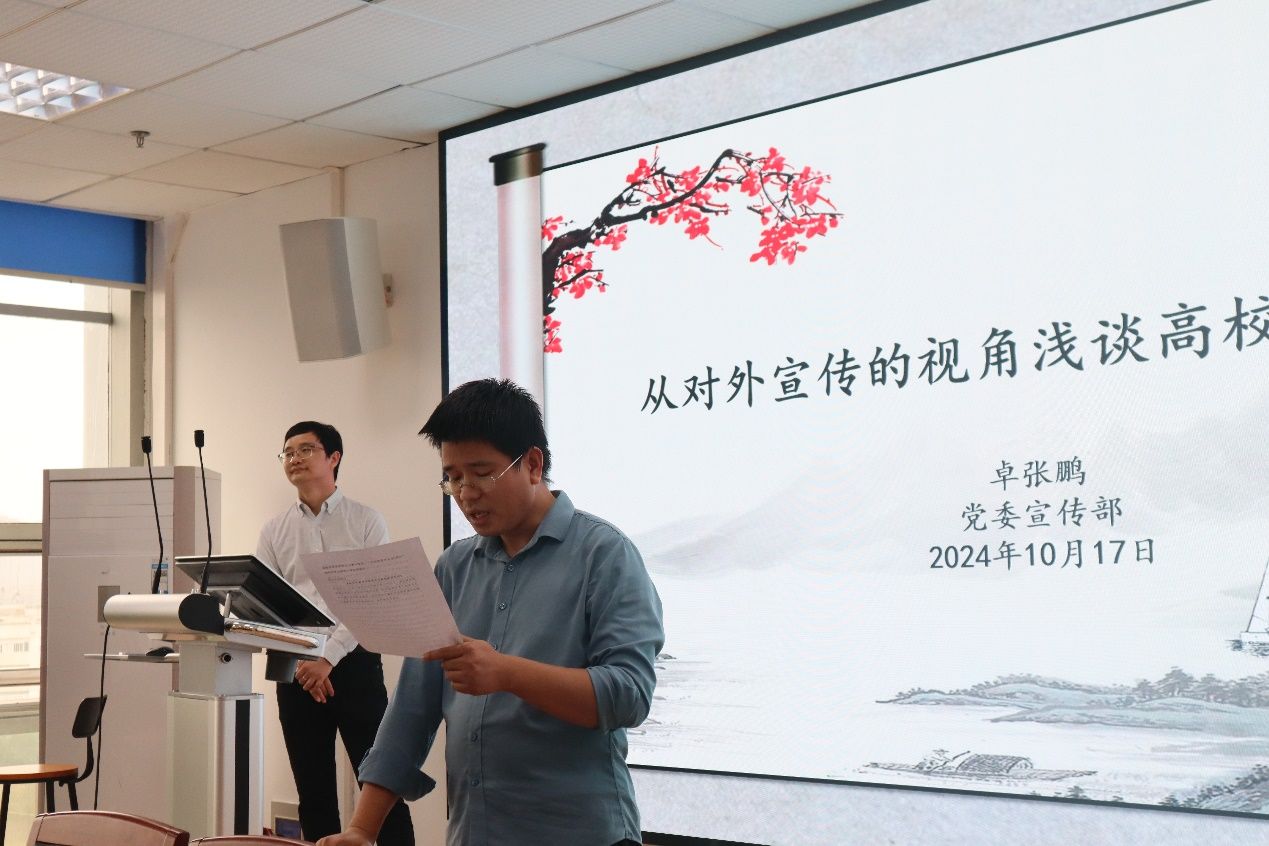 (通讯员/董珈彤)2024年10月17日下午两点,足球现场比分 “一融双高”宣传工作专题培训会在文澴楼709会议室举行。本次培训聚焦足球现场比分新闻 宣传策略与技巧,特邀校党委宣传部外宣办主任卓张鹏老师授课,足球现场比分 教师党支部、行政党支部、学生党支部委员以及学院教师代表参加学习。培训会由学办主任余利老师主持。