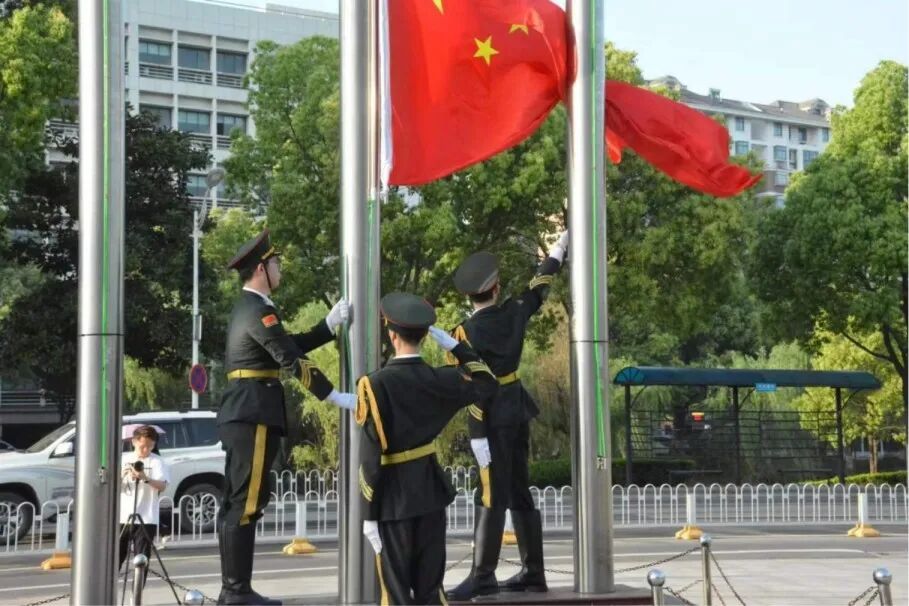 清晨微光中,国旗护卫队迈着铿锵有力的步伐,护送国旗抵达广场。全体师生齐声高唱国歌,注视五星红旗在庄严的旋律中冉冉升起。