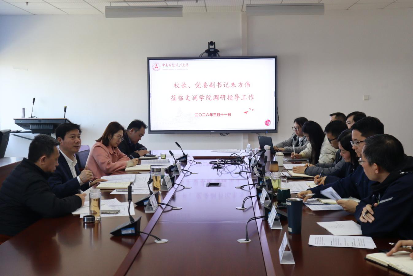 朱方伟校长听取汇报后,紧扣学院“特区”定位与发展实际,从顶层设计、学科布局、人才培养、师资引育、规划改革、党建融合等维度提出指导要求。他强调,学院要坚持以改革“特区”建设为牵引,坚持党政同责、协同发力,努力为学校高质量发展作出积极贡献。一是坚持党建引领,深化“一融双高”建设。以正确政绩观学习教育为抓手,强化教职工思想引领,实现党建与业务深度融合,以高质量党建为学院改革发展提供坚强保障。二是聚焦立德树人,提升育人质量。立足学院发展定位,完善人才培养体系,着力提升拔尖创新人才培养水平,助力高素质专业化人才成长。三是统筹学科建设,增强发展动能。科学优化学科结构,推动传统学科提质升级,积极布局新兴交叉学科,以特色学科建设助力学校学科整体发展。四是抓实人才工作,汇聚发展合力。强化高层次人才与青年人才引育力度,完善人才服务保障机制,营造良好人才发展环境。五是健全落实机制,提升治理效能。坚持问题、目标与结果导向,完善工作推进与考核评价体系,推动各项任务落地落实、取得实效。